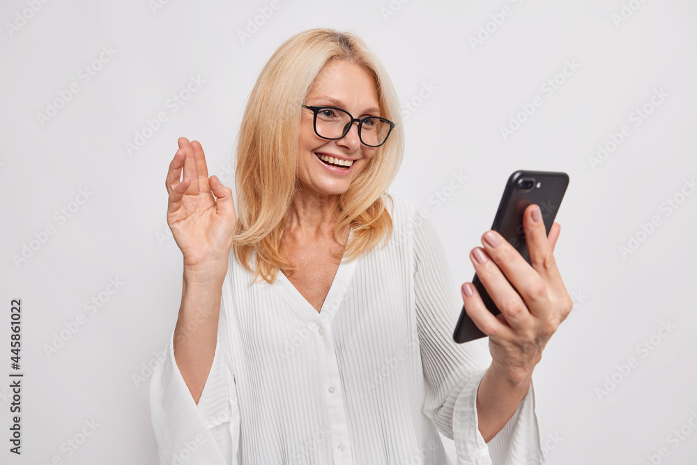 Happy woman glad to make distance call has online comversation with daughter waves palm in hello gesture holds mobile phone uses high speed internet connection wears silk white blouse glasses