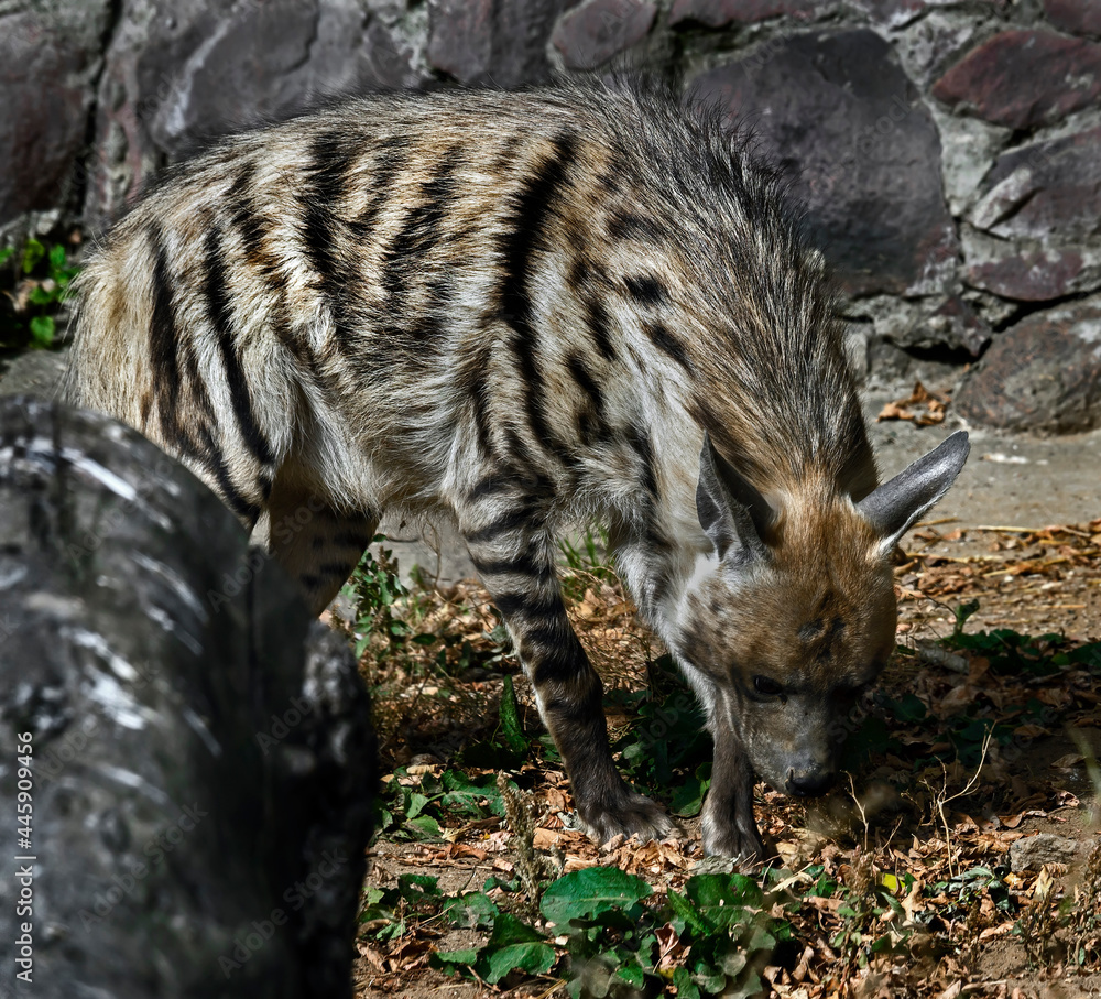 Striped hyena in its enclosure. Latin name - Hyaena hyaena