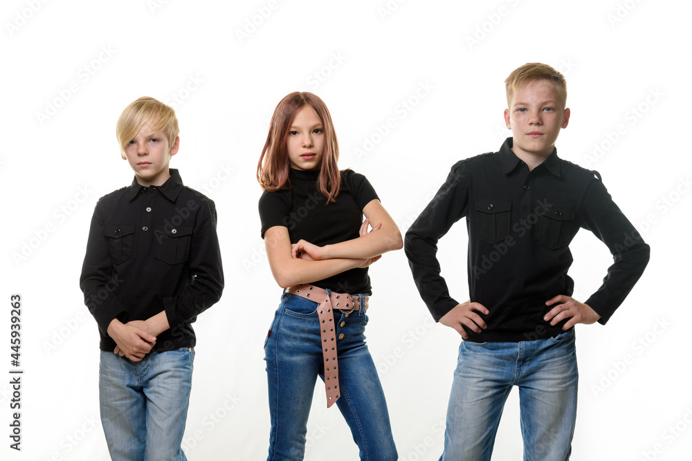 Portrait of teenagers - two boys and girls of European appearance in dark casual clothes on a white background