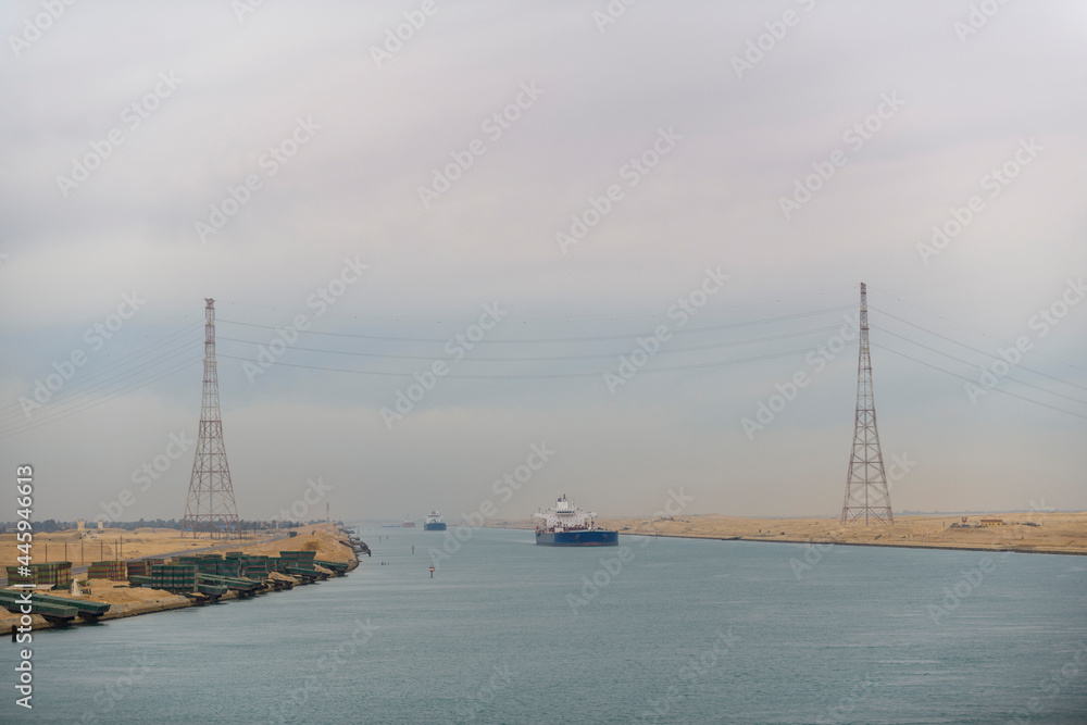 Suez canal transit. View from cargo vessel. Work at sea. Commercial shipping.