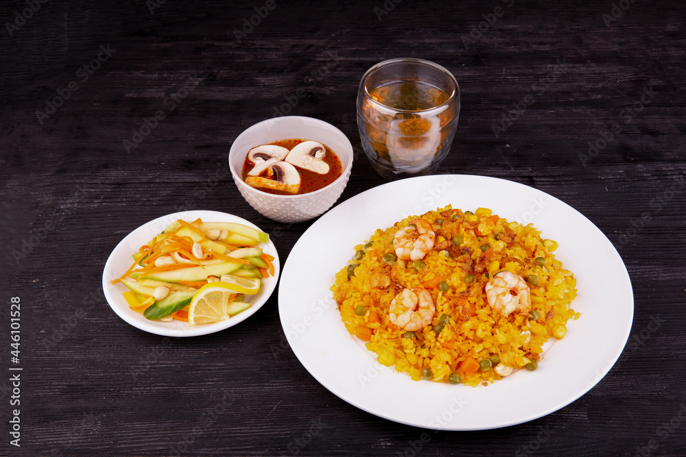 fried rice with seafood, served with salad tea and sauce with mushrooms