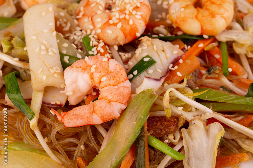 glass noodles with shrimp and sesame, bean sprouts and greens