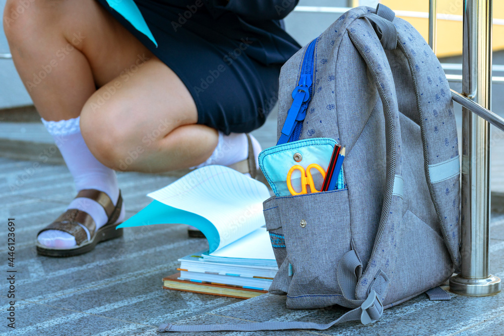 schoolgirl on the background of the school. Concept school days, Back to school. girl in a uniform with a backpack. pupil, learner, scholar. A student holds a books and notebooks