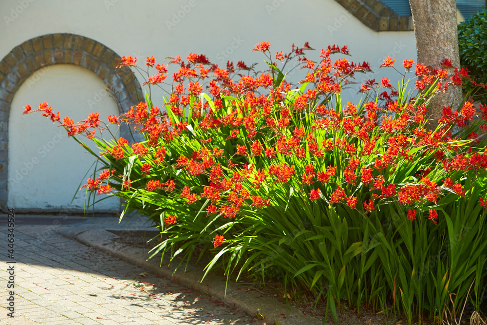 A Crocosmia called Lucifer in a garden setting with wall brick in background.