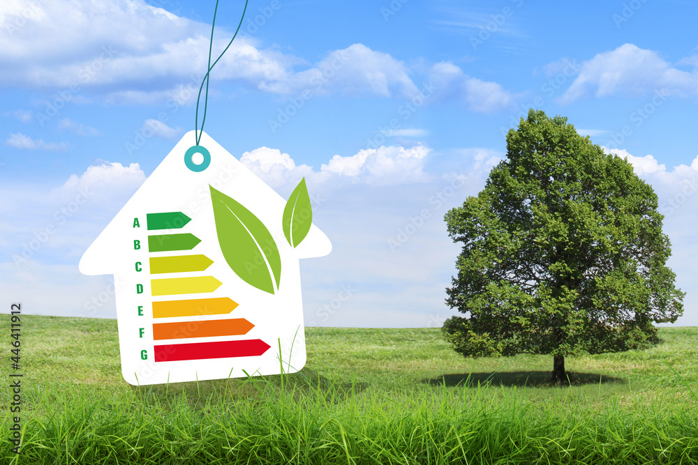 Transition écologique et performance énergétique, maison écologique dans la nature avec ciel bleu.