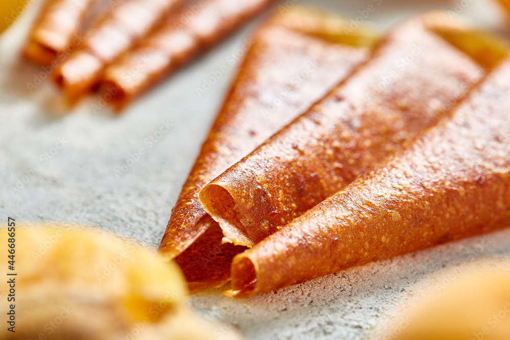 Fruit marshmallow. Berry pastille on light background. Pastille fruit rolls