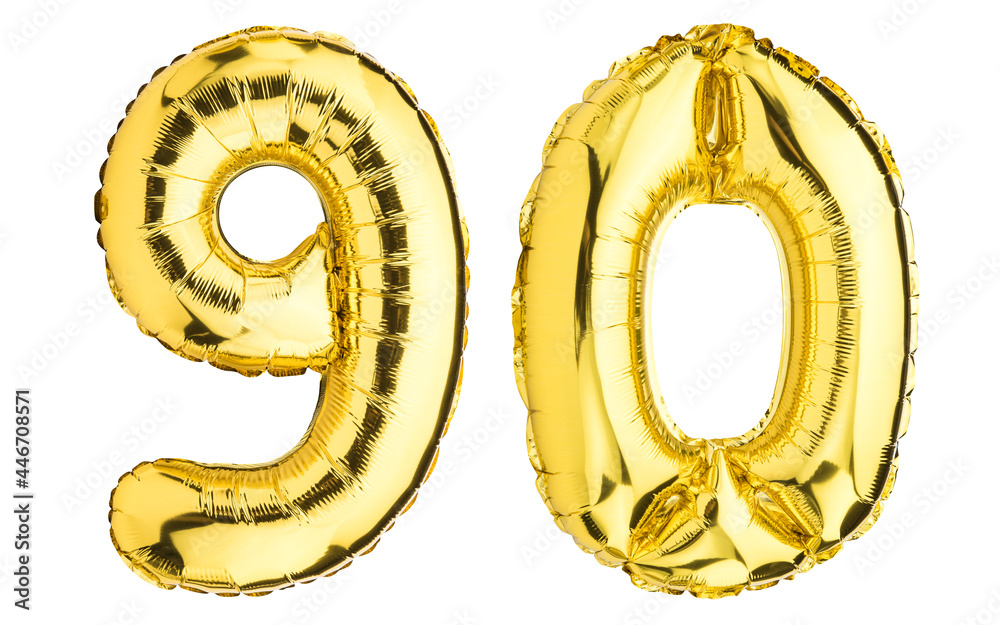 Number Ninety 90 balloons. Helium balloon. 90% off. Golden Yellow foil color. Birthday Party, greeting card, Sale, Advertising, Anniversary. High resolution photo. Isolated on white background.