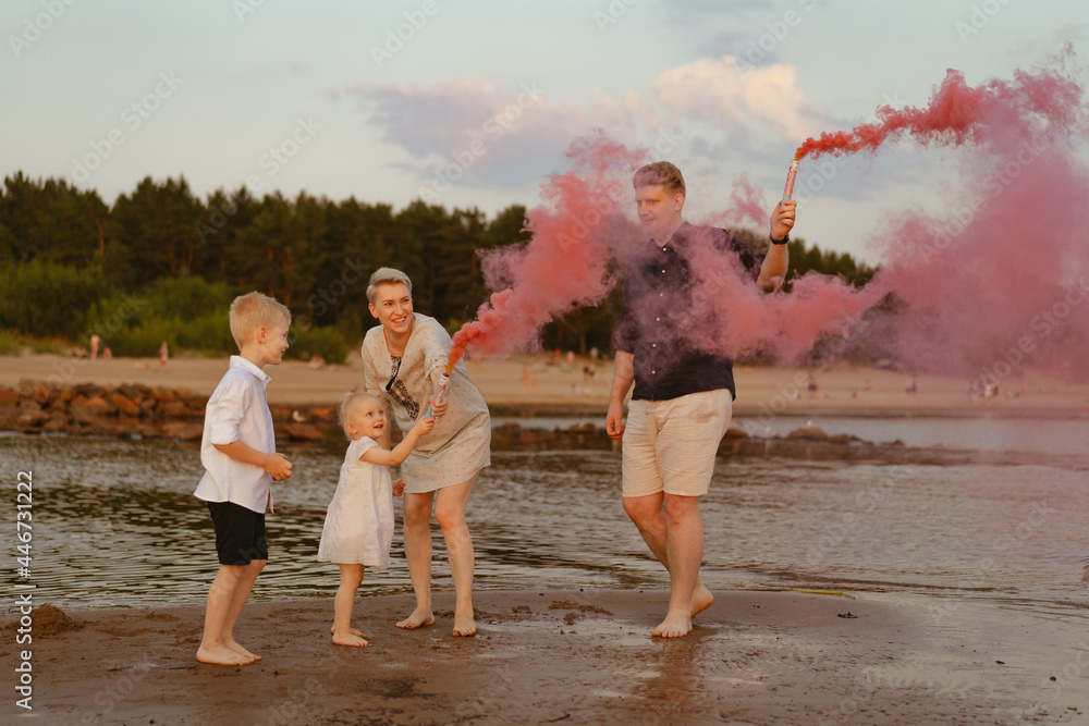 Gender reveal announcement on the beach. Loving family expecting baby girl. Happy moments