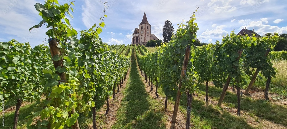 View on the vineyards and an old church in Hunawihr in Alsace, France