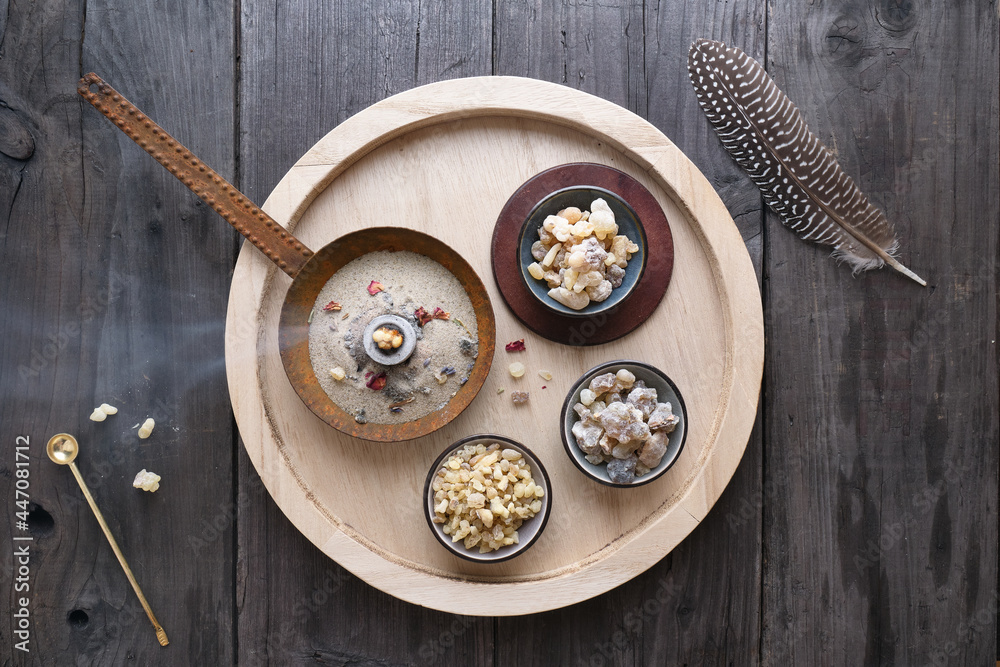 Weihrauch räuchern – Weihrauch Harz Arabien Aden, Jemen und Oman auf Holzteller mit Räucherkohle, Räucherlöffel und Feder von oben
