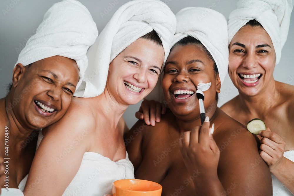Multigenerational women having fun applying face beauty masks on their face - Main focus on caucasian woman face