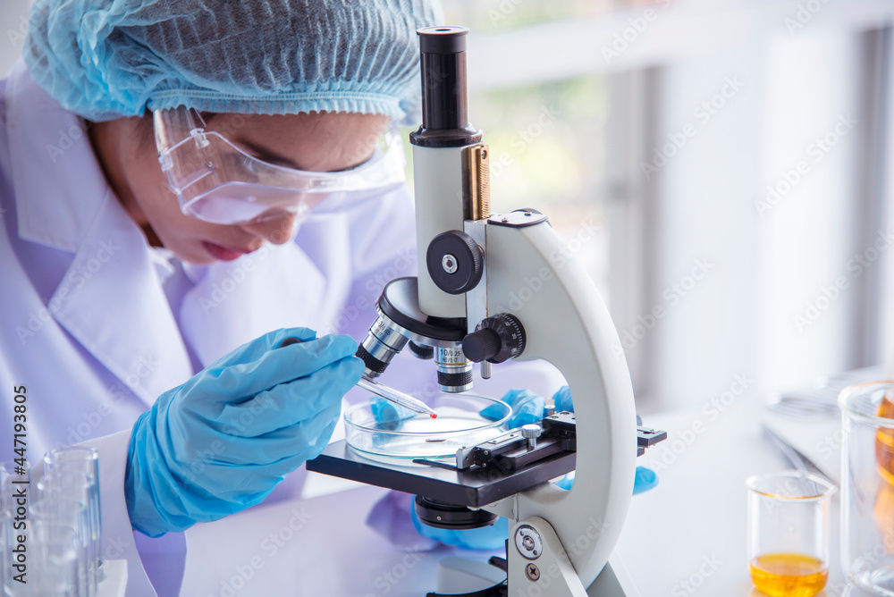 Woman scientist in lab look at science microscope medical test and research biology chemistry. Females technician laboratory analyzing scientific pharmacy genetic research. Chemistry Medical test lab
