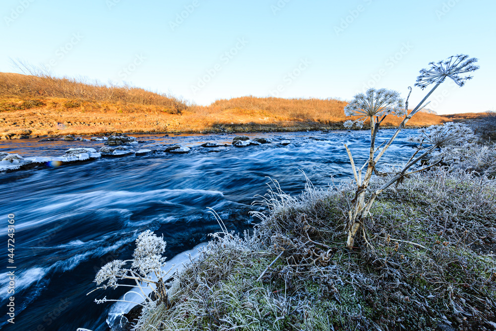 Vereiste Blumen am Fluss Bruará, Golden Circle, Südisland