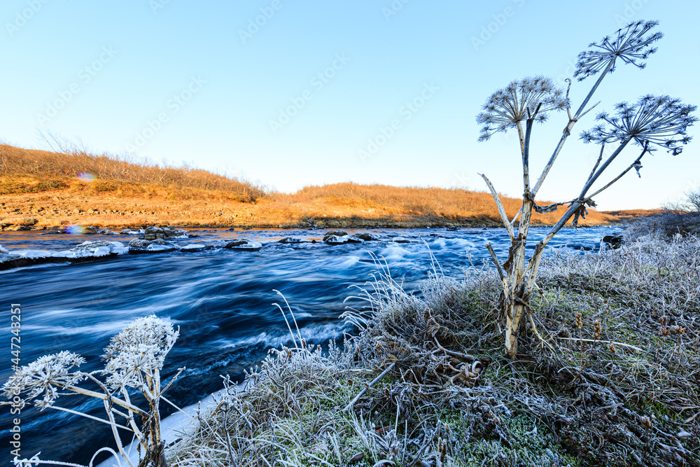 Vereiste Blumen am Fluss Bruará, Golden Circle, Südisland