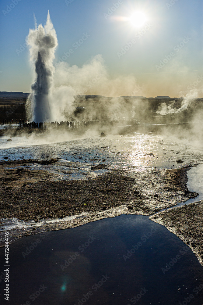Heiße Quelle, hinten Eruption des Geysir Strokkur, Geothermalgebiet Haukadalur, Golden Circle, Südisland