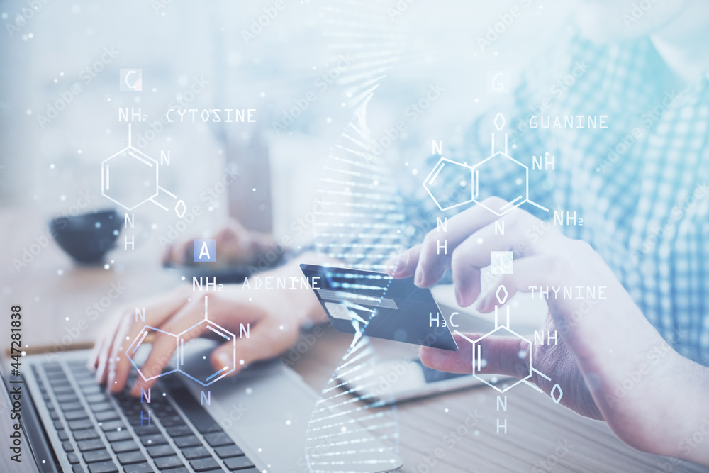 Double exposure of man hands holding a credit card and DNA drawing. On-line Education and E-commerce concept.