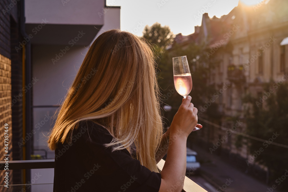 Girl with a glass of rose wine on the balcony. Drinks rose wine and enjoy the moment. A celebration holiday alone. Relaxed lifestyle. Happy woman rest after work. Beautiful European courtyard