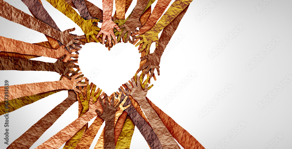 Diverse hands heart and united diversity or unity partnership in a group of multicultural people connected together shaped as a support symbol expressing the feeling of teamwork and togetherness
