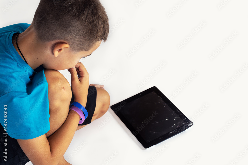 Seven years old boy sits down on the floor close to tablet computer with broken screen glass. Result of falling or childish prank. White background, copy space.