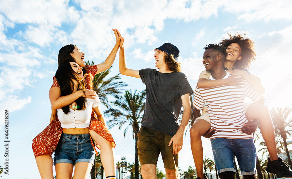 Group of happy multiracial friends celebrating outdoors with back sunlight - Multiethnic people having fun together on holidays while walking in a park- Happiness, friendship and holidays concept