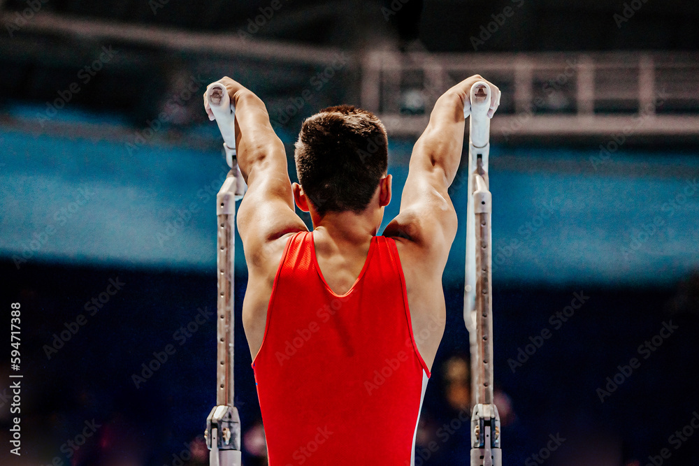 Full length body size view of trendy tired weak guy nerd sportsman lifting heavy barbell isolated over bright green color background