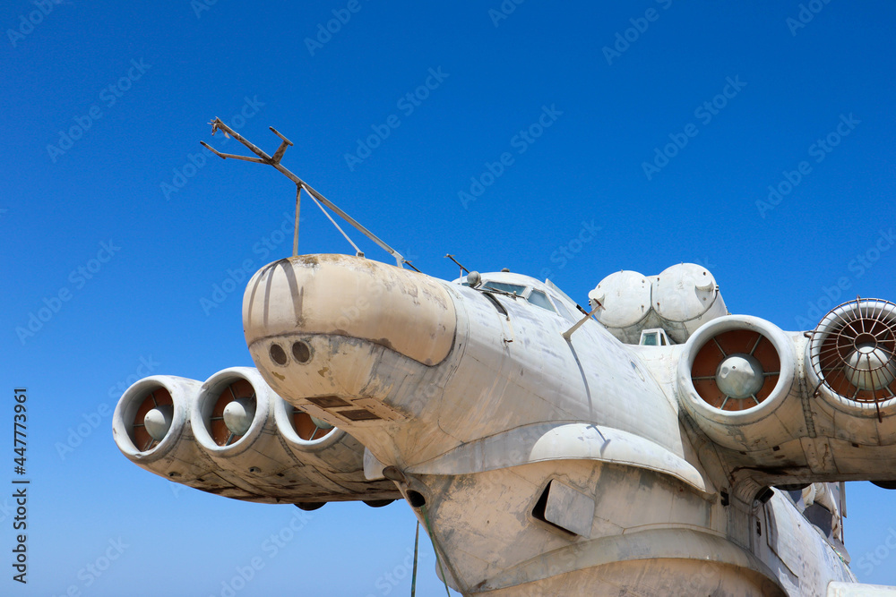 Nose, cockpit and engines of Lun-class Ekranoplan floatplane - unique soviet weaponry against blue sky