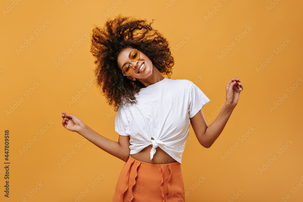 Emotional curly girl in light t-short playing her hair on isolated backdrop. Joyful woman in glasses poses on yellow background..