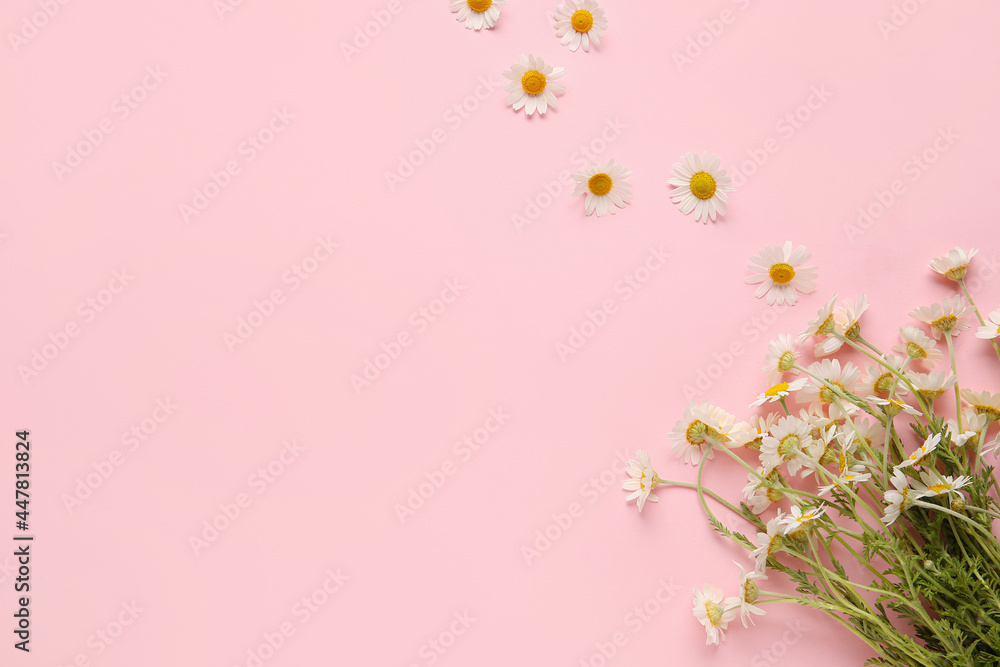 Beautiful chamomile flowers on color background
