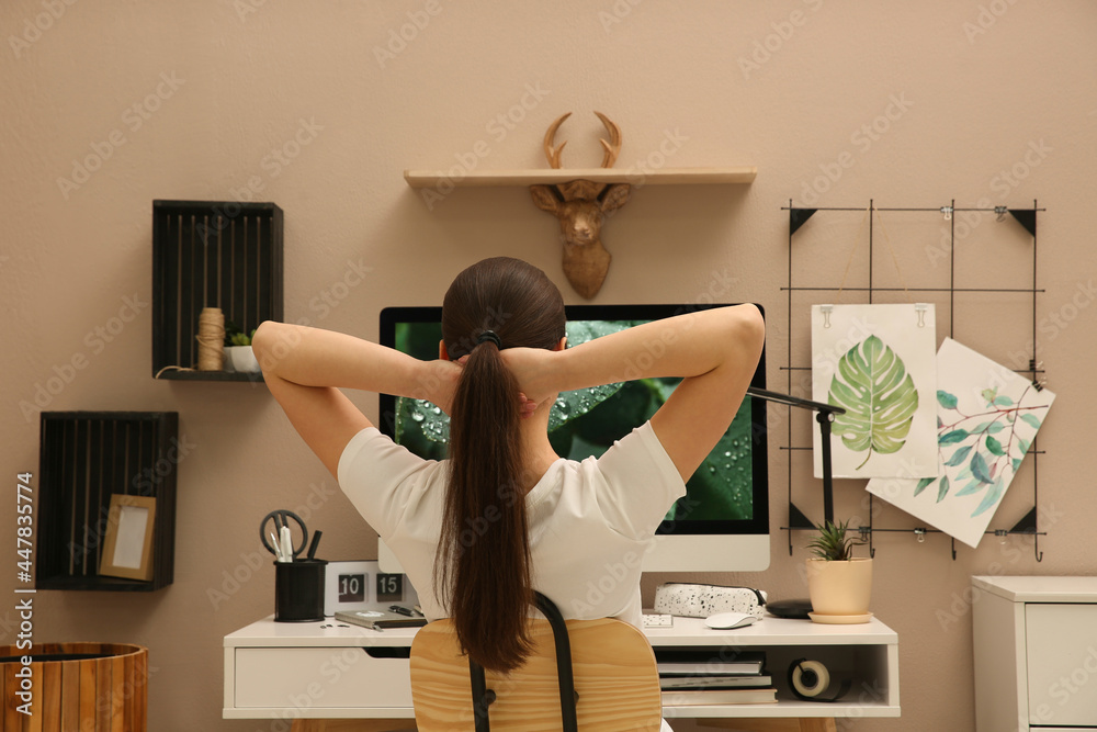 Woman sitting at white desk with computer near beige wall, back view. Interior design