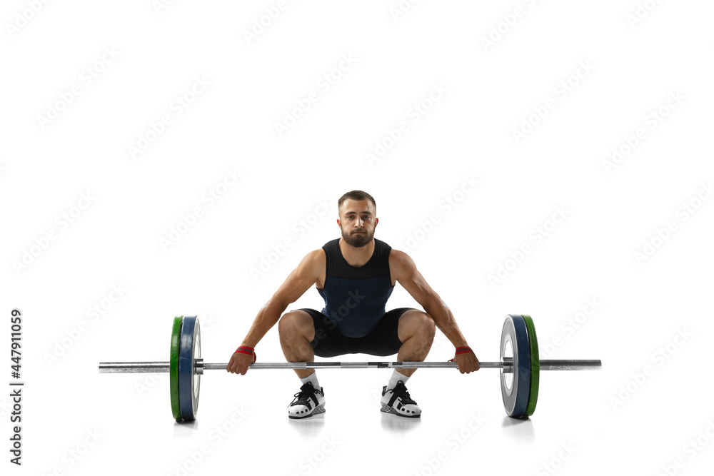 Full length portrait of a man in sportswear exercising with a weight isolated on white background