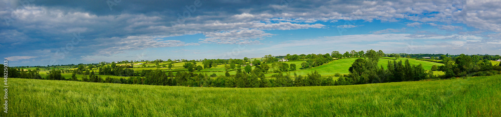 Rich, verdant, green rolling agricultural fields near Markethill in County Armagh in Northern Ireland, UK. A panoramic view taken on a sunny day in summer with light clouds.