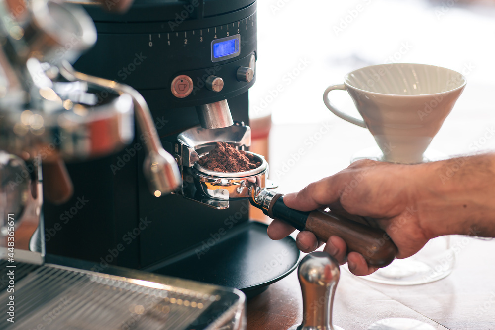 Coffee portafilter engaged bean grinder, close up detail view copy space includes.