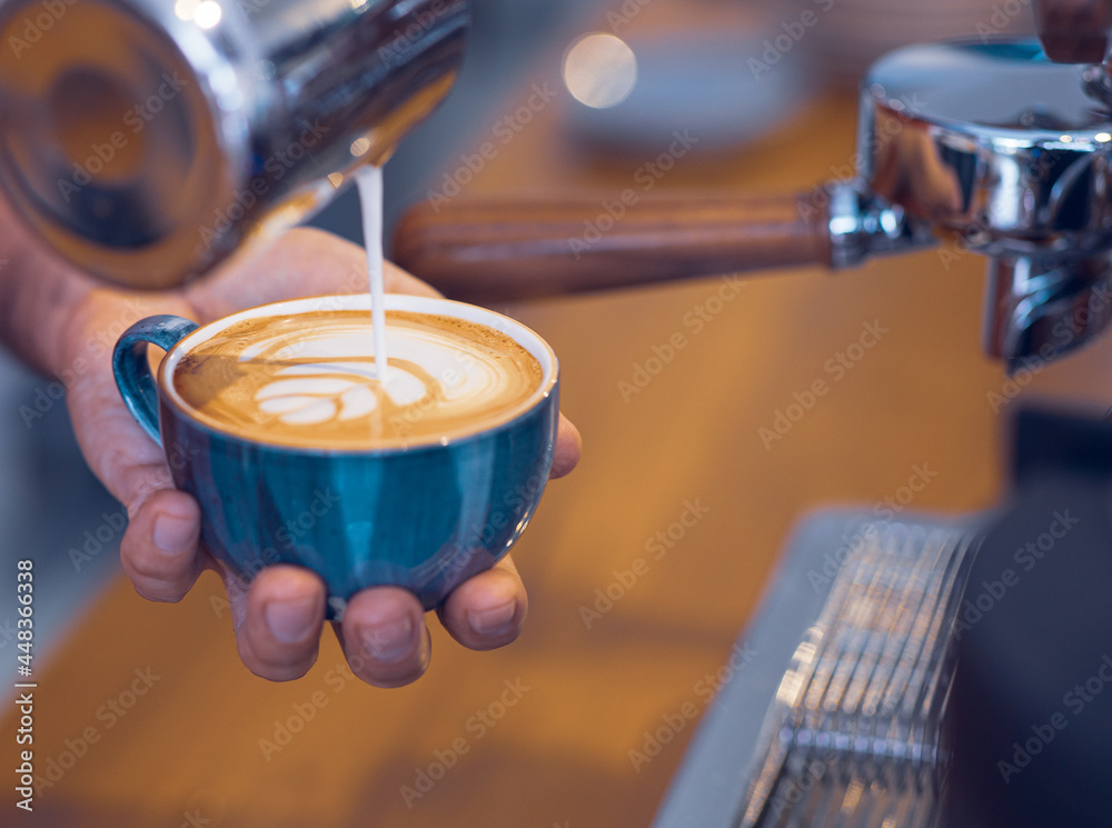Artistic designed coffee latte view with coffee beans from a barista desk.