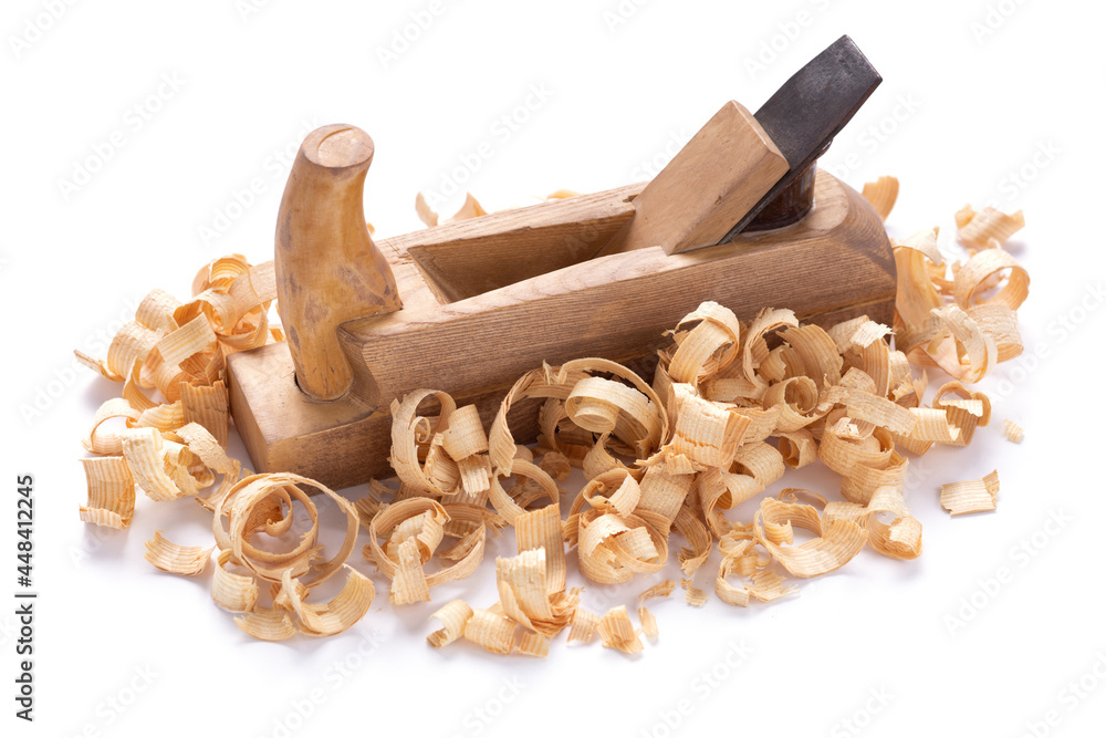 Plane tool for carpenter or joiner and wood shavings isolated on white background