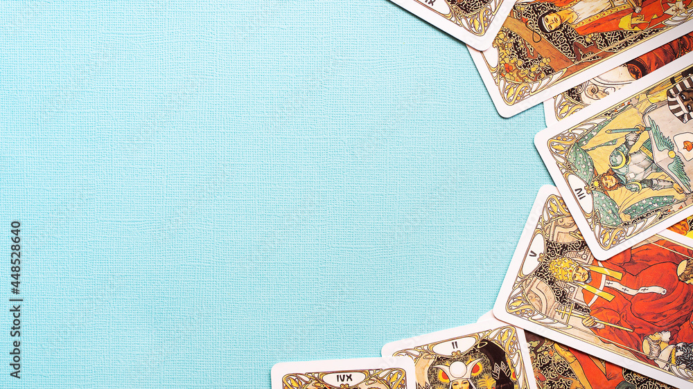 View of Golden tarot cards Frame on the Blue background, esoteric concept,