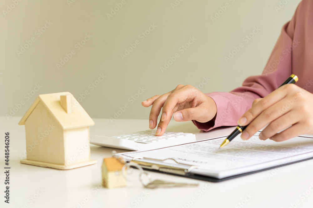 Businessman or home sales representative working Businessman or home sales representative working with contract documents and calculators with laptops. To calculate interest, taxes and profits for rea