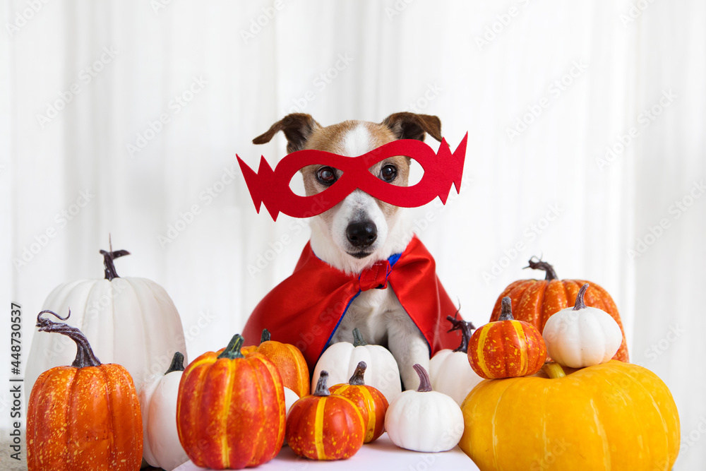 Jack russell terrier dog in a superhero costume among orange pumpkins on a white background. Portrait of a cute young small pet sitting with a halloween costume and decoration indoors