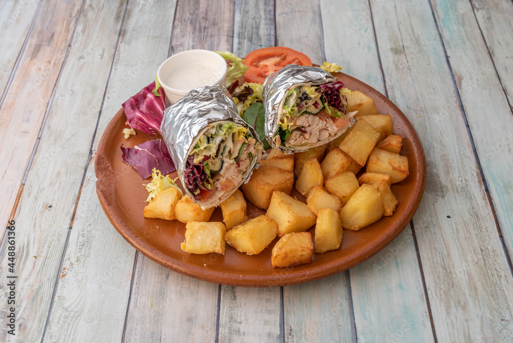 burrito with chicken and lots of lettuce rolled with aluminum foil and a garnish of diced french fries on a clay plate