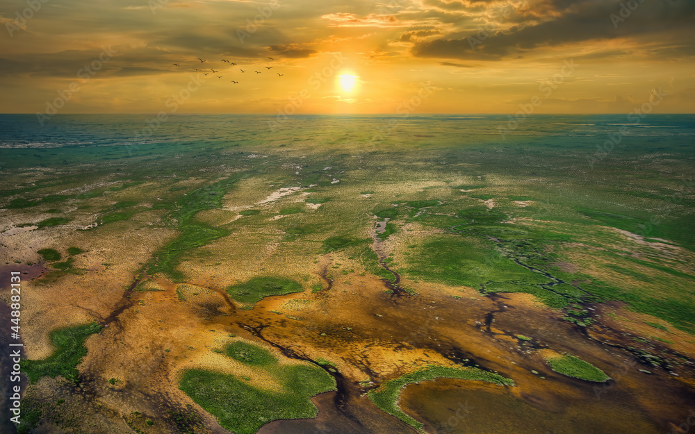 Aerial view of golden hour sunset over Everglades National Park in South Florida