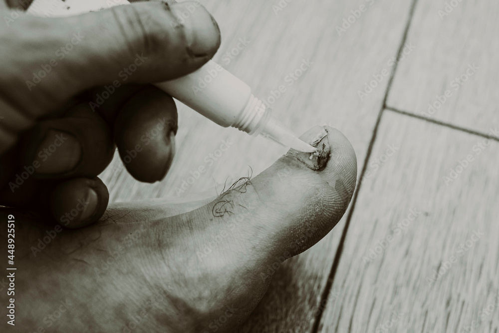 applying an antifungal agent to the toenail of the affected by the fungus close-up, the foreground and background are blurred with a bokeh effect