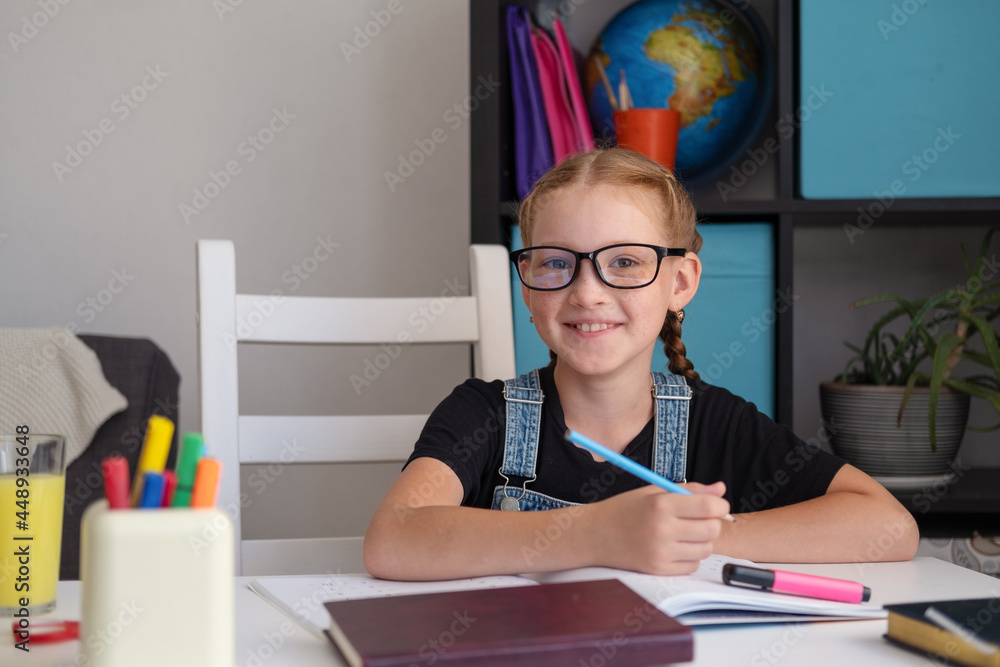 cute happy caucasian redhead girl studying at home