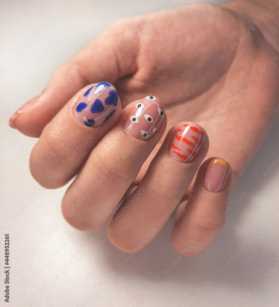 Camouflage gel nail polish with multi-colored design and different patterns. Manicure beige color with patterns. Coating on the nails with a design of geometric patterns.