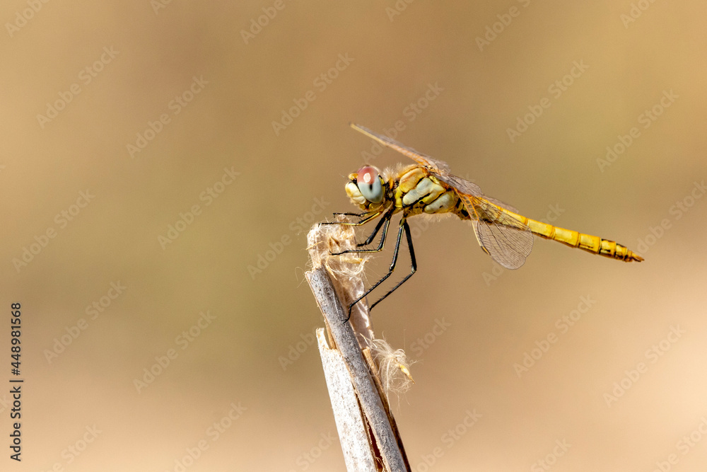 Beatiful dragonfly in the foreground perched on a reed and blur bokeh background