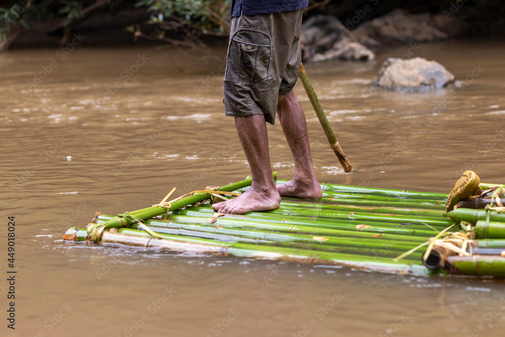 bamboo raft in the river Transportation of rural villagers in the forest, no roads, various uses of bamboo.