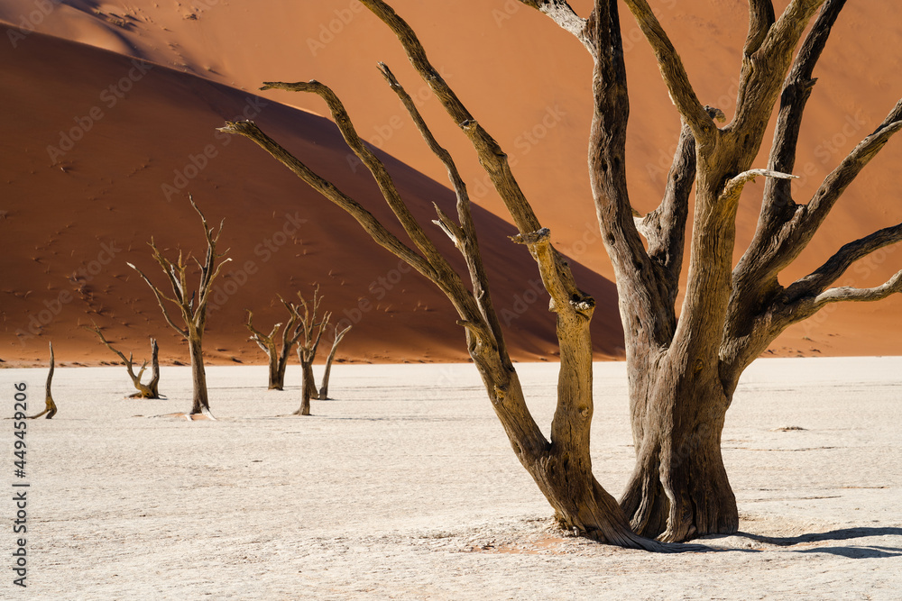 Dead Camelthorn trees against towering sand dunes at Deadvlei in the Namib desert, Namib-Naukluft National Park, Namibia.