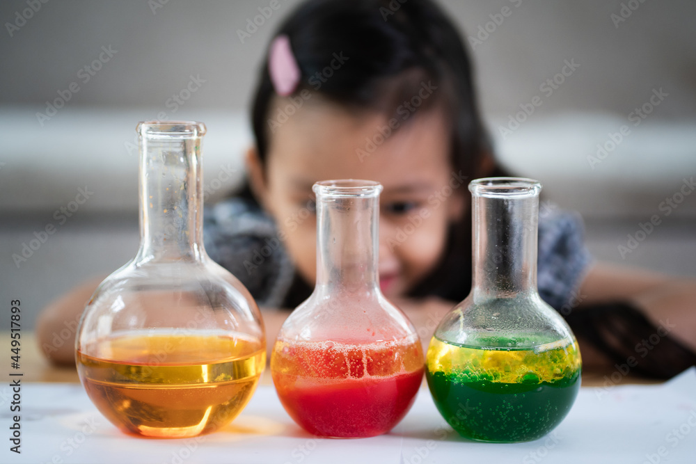 Unidentified 5 years old student is observe the water and oil separation for liquid density easy science experimental at home, homeschool, stem education, self learning for kid in family life.