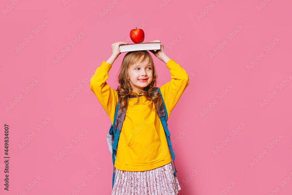 Back to school. Happy blonde child holds a book and a red Apple in her head on a pink background. Education and intellectual development of children. World book day.
