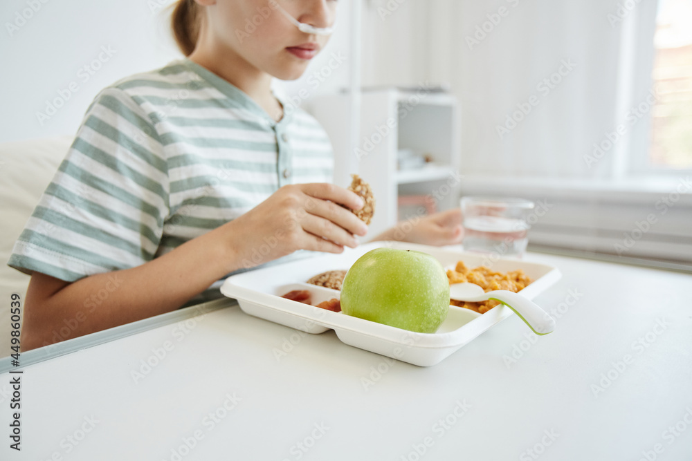 Cropped shot of girl eating healthy lunch in white hospital room, background with copy space