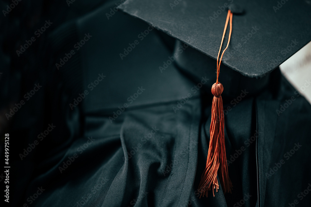 A black graduation cap with a brown tassel is placed on the graduation gown.