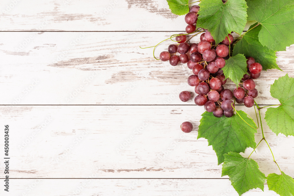 Bunch of ripe green grape with leaves on white wooden background top view.